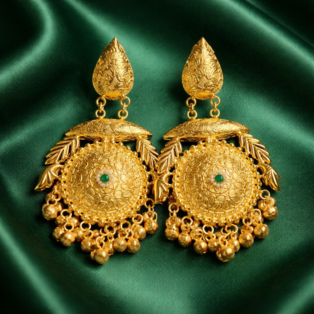 Make a grand entrance with Priva Kanika Gold Jhumkas these magnificent antique-finish statement earrings. Crafted with meticulous attention to detail, these traditional drops feature a gorgeous circular mandala motif at their core, beautifully framed by delicate golden leaf accents. At the center sits a vibrant red stone, elegantly haloed by miniature pearls for a touch of classic contrast. Perfect for weddings, festive occasions, or elevating any ethnic ensemble, these heritage-inspired earrings are a true testament to timeless craftsmanship.
