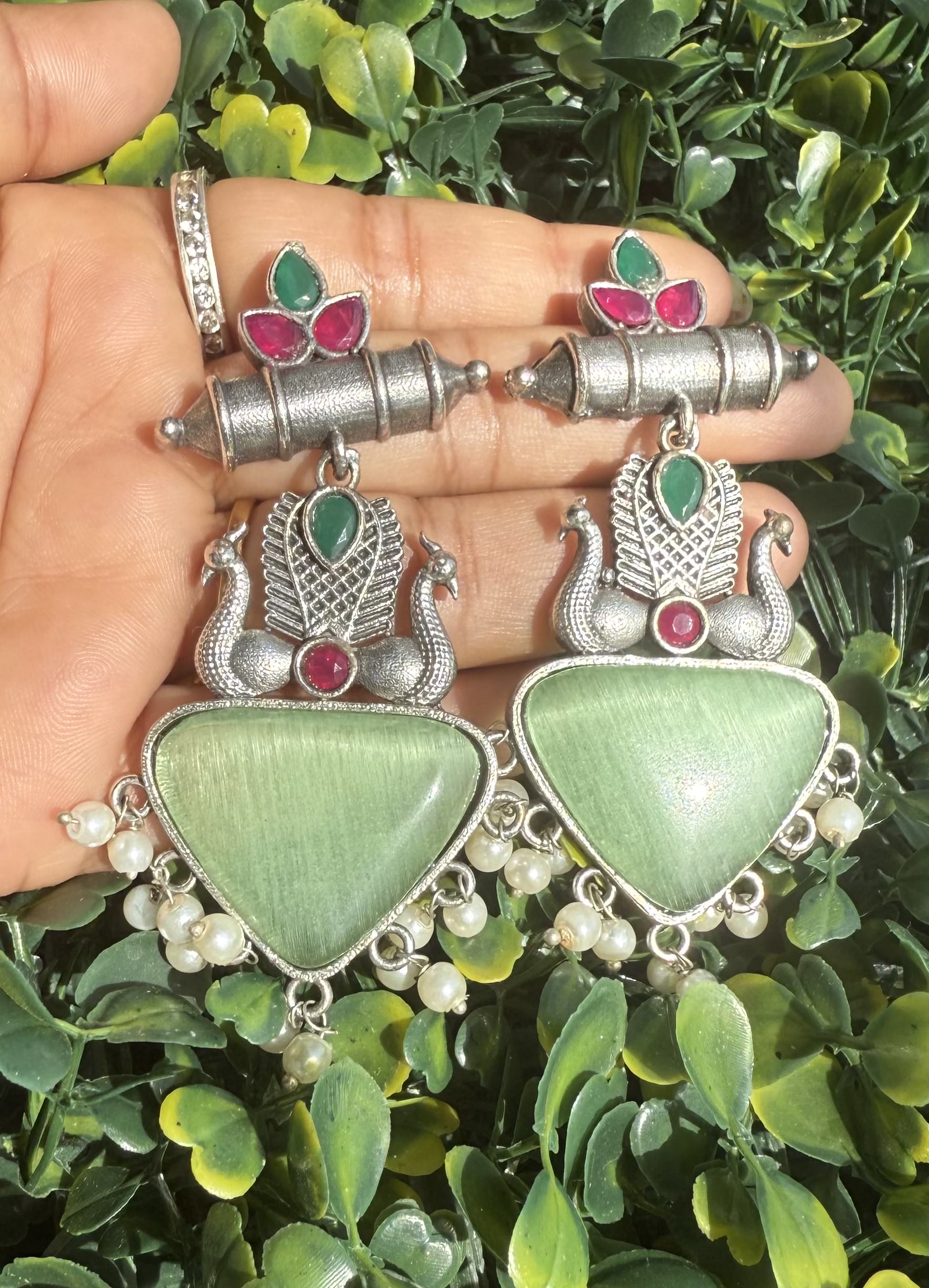 Tarini Mint EarringsOxidised Silver Look Peacock Earrings with SageGreen Stone & Pearl Drops