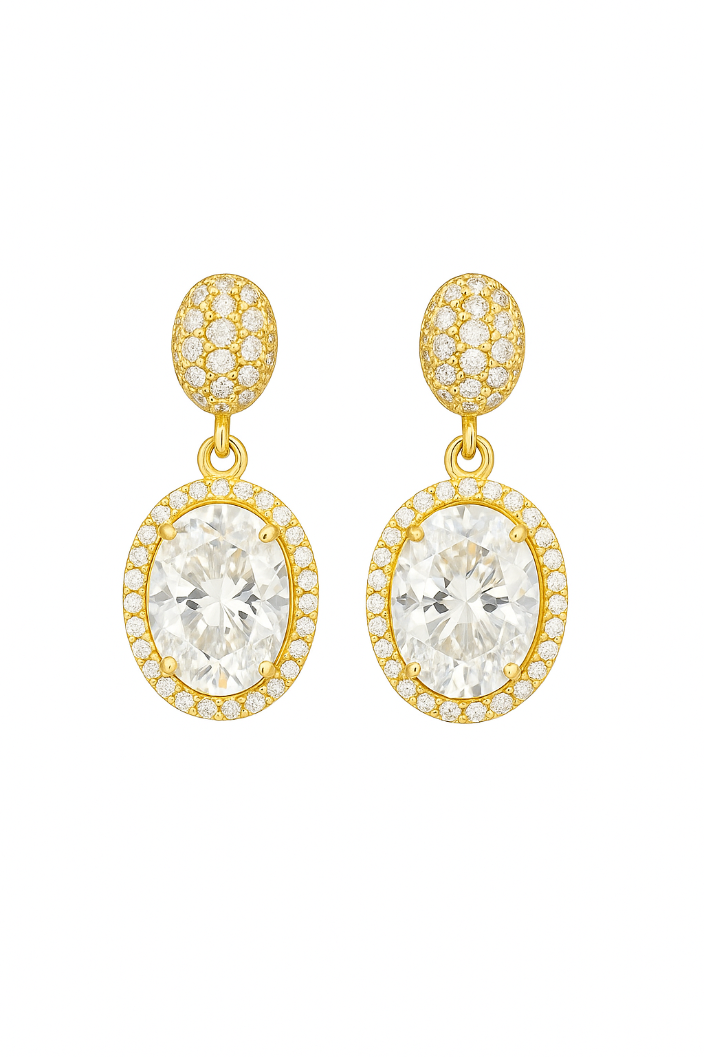 The Priva Aurelia Halo Drop Earrings are crafted to embody timeless luxury with a modern golden glow. Featuring a brilliant round-cut centerpiece wrapped in a delicate halo of shimmering stones, these earrings are designed to reflect light like liquid gold.