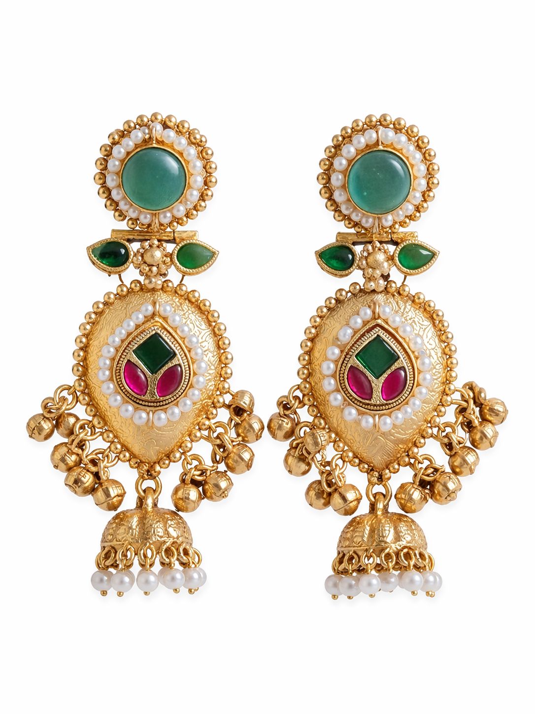 Elegnat Priva Shringar Jhumka earrings crafted with detailing and a rich gold findi. Aceeented with green and ruvy toned stones and finished with delicate pearl drops, this piece beautifully reflects traditional indian bridal charm.